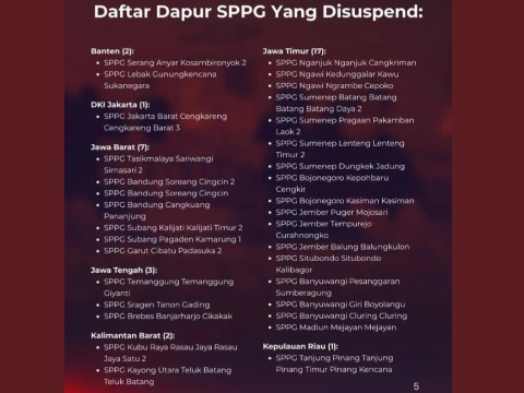 Berdasarkan infografis yang diterima media ini dari sumber tangkapan layar story WhatsApp, data dapur SPPG yang disuspend di beberapa provinsi, di antaranya Banten ada 2, DKI Jakarta ada 1, Jawa Barat ada 7, Jawa Tengah ada 3, Kalimantan Barat ada 2, Kepulauan Riau ada 1, dan Jawa Timur ada 17.