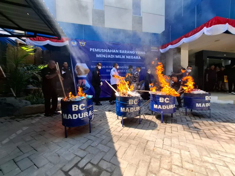 PAMEKASAN, Seputar Jatim – Kantor Pengawasan dan Pelayanan Bea dan Cukai Tipe Madya Pabean C (KPPBC TMP C) Madura melaksanakan kegiatan pemusnahan Barang Milik Negara (BMN) hasil penindakan di bidang cukai.
