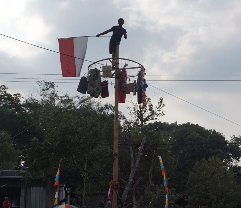 Tiang panjat pinang yang memiliki dasar yang halus dilumasi dengan oli membuatnya menjadi licin dan sulit dijangkau. Para peserta harus bekerja sama untuk mencapai puncak dan mendapatkan hadiah di puncak tiang tersebut. Lomba ini melambangkan semangat gotong royong dan kebersamaan dalam mengatasi rintangan.